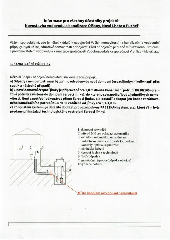 Od 13.11.2025 je možné zahájit napojování jednotlivých nemovitostí na veřejný vodovod a kanalizaci. Vodoměry se začnou montovat od 24.11. Na kanalizaci je možné po domluvě s panem Jirouškem se napojit již nyní.