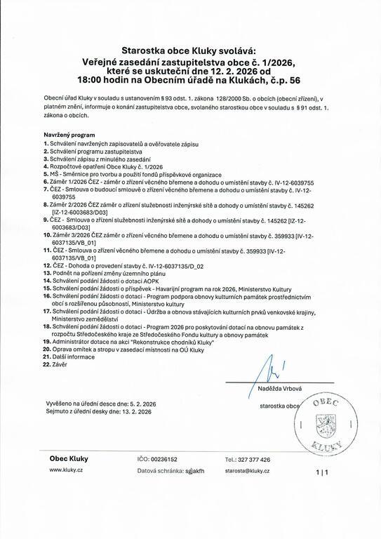 Srdečně zveme všechny občany na Veřejné zasedání zastupitelstva obce, které se koná 12.2.2026 od 18. hod. na OÚ na Klukách